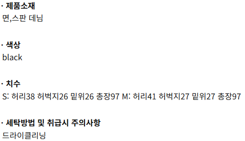 | 치수 | S: 허리38 허벅지26 밑위26 총장97 M: 허리41 허벅지27 밑위27 총장97 |
